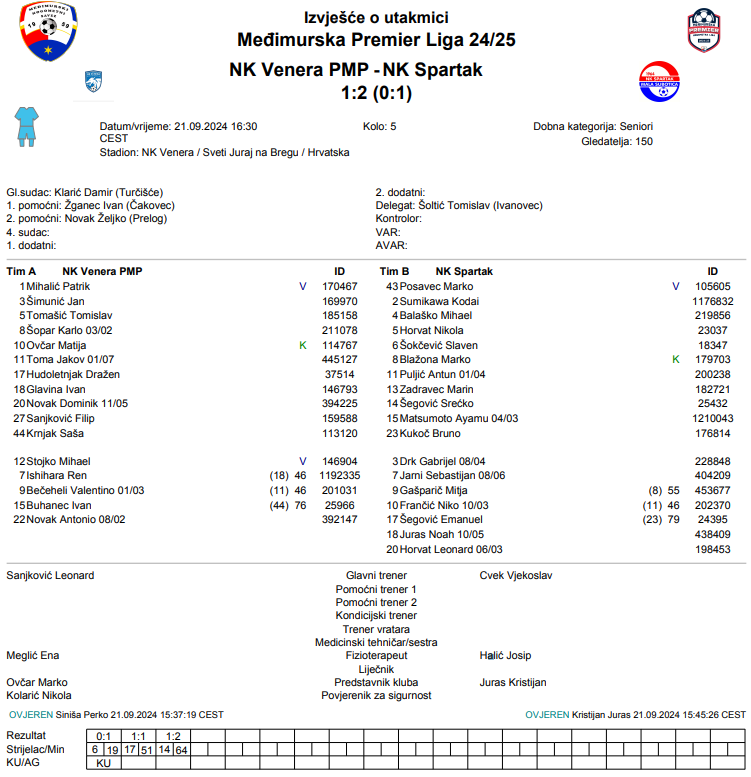 Inače ne komentiram suđenje, ali danas je glavni akter svih zbivanja na terenu nažalost bio glavni sudac, umjesto igrača. Utakmica do 19. minute fer i korektna uz nešto više naše inicijative. U 19. minuti dosuđen je penal za goste iz kojeg postižu pogodak. Nakon toga naša inicijativa se još pojačala što je rezultiralo golom u 51.minuti. Mislim da je intenzitet prekršaja koji je prethodio golu bio u rangu dosuđenog penala za gosta. Međutim, drugi gol su gosti zabili iz totalno nekorektne i nesportske situacije u kojoj je prvo sudac napravio previd ne dosudivši prekršaj nad našim igračem. Onda je i ekipa Spartaka nastavila s napadom (naš igrač ozlijeđen leži na terenu) i iz te situacije postigla pogodak. Nakon toga utakmica je postala previše nervozna, a sudac više nije imao ni to malo kontrole koju je imao do tada. Gosti su na sve moguće načine sprječavali naše pokušaje za postizanjem izjednačujućeg pogotka. To je na kraju rezultiralo crvenim kartonom, nekoliko žutih i nažalost našim ozlijeđenim igračem. Na kraju svega, u 77. minuti nije dosuđen kazneni udarac za nas iz iste situacije kao što je bio dosuđen prvo poluvrijeme za gosta, a sa još većim intenzitetom udarca nogom po nozi. Čestitam gostima na pobjedi! – osvrnuo se na poraz Leonard Sanjković, trener Venere.