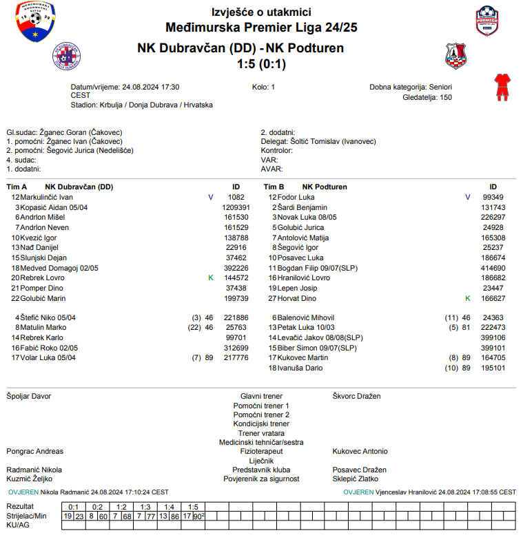 Podturen je odlično otvorio sezonu i postigao pet pogodaka u Donjoj Dubravi. Novi član Premier lige je u prvom dijelu utakmice uspio parirati gostima, ali ih je Lepen doveo u prednost u 23. minuti. U drugom dijelu apsolutna kapitulacija Dubravčana koji je primio još četiri pogotka. Šegović i Antolović poentirali su sredinom drugog dijela, a Petak i Kukovec svoje su pogotke postigli u završetku utakmice. Domaćin je do utješnog pogotka stigao preko Andrlona u 80. minuti utakmice.