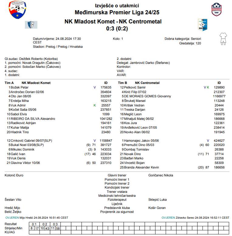 Mogu biti zadovoljan sa prvim poluvremenom, gdje smo stvarno bili agresivni i taktički izvanredni. U drugom poluvremenu smo u nekim dionicama malo pali, ali smo postigli pogodak. Domaćin je u 83. minuti imao jedini udarac u okvir gola. 0:3 u gostima je odličan rezultat i s tim moramo biti zadovoljni, idemo dalje! Sretno ekipi Mladost Komet u daljnjem natjecanju! – rekao je Nikola Goričanec, trener Centrometala.