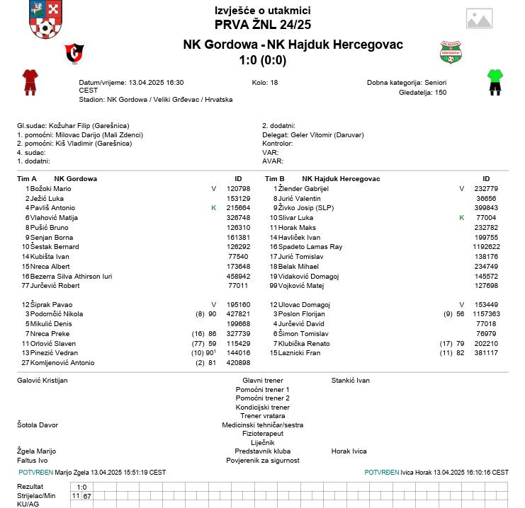 Gordowa je na domaćem terenu s minimalnih 1:0 bila bolja od Hajduka. Pogodak odluke postigao je Slaven Orlović u 67. minuti. Ovom je pobjedom domaćin skočio na peto mjesto prvenstvene ljestvice, preskočivši i svog današnjeg suparnika.