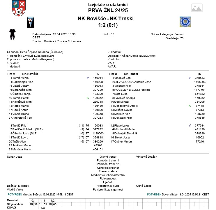 Jako važnu gostujuću pobjedu ostvarila je ekipa Trnskog. Poveli su gosti u 38. minuti pogotkom Filipa Dokladala. U 53. minuti Patrik Tomić izjednačio je rezultat, no u 65. Mihael Đođ postiže gol vrijedan velika tri gostujuća boda.