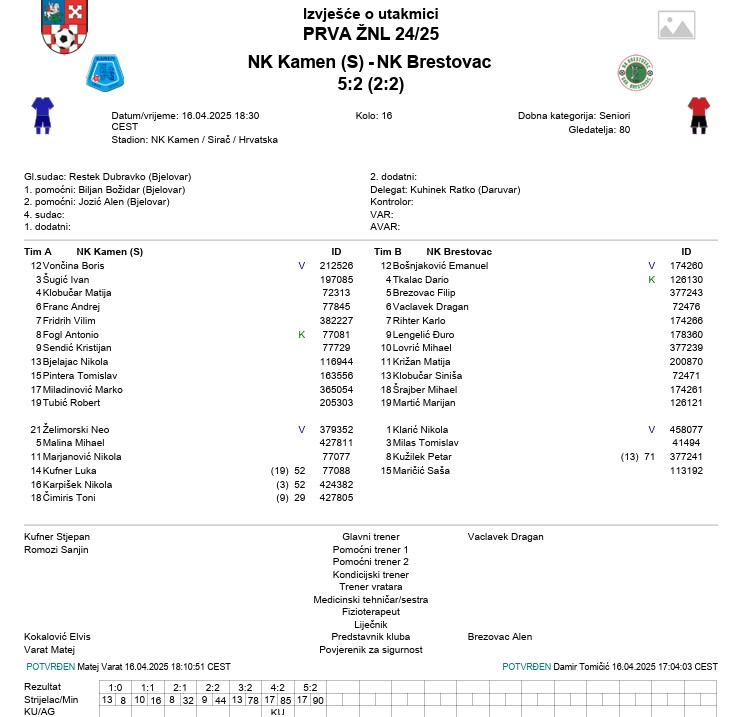 Danas je odigrana jedna zaostala utakmica 16. kola 1. ŽNL Bjelovarsko-bilogorskog saveza, od ukupno četiri koje su bile odgođene radi silne kiše koja nije dozvolila odigravanje. Preostale odgođene utakmice odigrat će se 30.4. i 1.5. Danas su svoj susret odigrali Kamen i Brestovac, a domaćini su zabili pet golova i tako ostvarili vrijednu pobjedu.