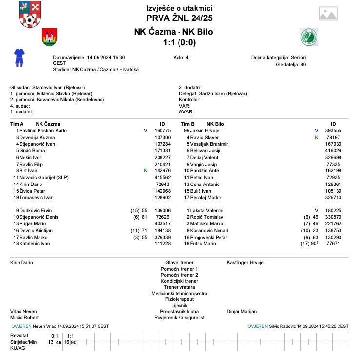 “Imali smo danas prvu utakmicu pred domaćom publikom u novoj sezoni i krenuli smo od početka s visokim presingom i željom da pobijedimo. Odigrali smo dobro prvo poluvrijeme i kontrolirali utakmicu i nažalost iz nekoliko naših prilika nismo zabili gol. Odmah na početku drugog poluvremena iz naše greške na centru iz kontre dobivamo gol. Nakon toga se otvaramo i tražimo cijelo vrijeme gol, ali se gosti dobro brane i iz kontre nam prijete i rade prilike. Borili smo se do zadnje minute i na kraju nas je nagradio gol u 93. minuti. Nadali smo se da ćemo danas osvojiti 3 boda, ali se moramo zadovoljiti s jednim. Čestitam Bilu na fer i korektnoj igri i da mi u idućoj utakmici uspijemo izvući više od jednog boda.” – riječi su Daria Kirina, trenera Čazme.