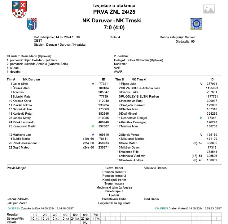 Prva od današnje dvije utakmice odigrana je u Daruvaru, gdje je domaćin s visokih 7:0 razbio Trnski. Već u 41. minuti bilo je 4:0 za domaćina, a sva četiri pogotka zabio je junak današnje utakmice, Karlo Karačić. Zabijao je redom u 10., 27., 40. i 41. minuti. Leonardo Patek je u 48. povećao na 5:0, da bi Matija Joščak u 54., te Nikola Plavšić u 74. minuti zaključili posao s konačnih 7:0. Daruvar preuzima prvo mjesto ljestvice s maksimalnih 12 bodova i gol razlikom 14:0. Trnski je sedmi.