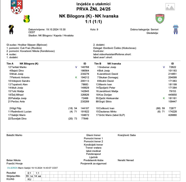 “Katastrofalan ulazak u utakmicu, nismo bili ista ekipa kao do sada u prvenstvu. Nismo se držali taktike i dogovora, puno individualnih pogrešaka i krivih odluka. I na kraju bod s kojim možemo biti sretni premda smo računali na dva, tri.” – rekao je Marko Balažić, trener Bilogore.