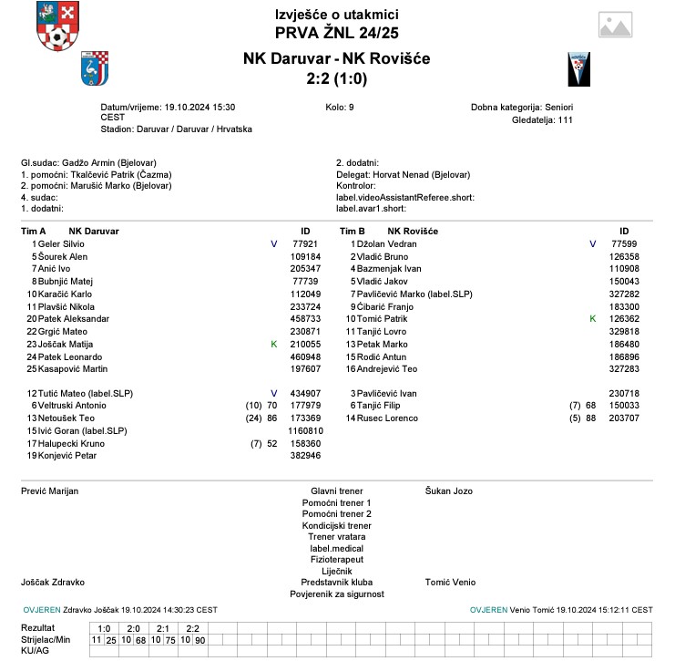 U Daruvaru je odigrana odlična utakmica gdje je istoimeni domaćin dočekao ekipu Rovišća. Počelo je dosta nervozno, već u 19. minuti igrač gostiju Antun Rodić dobiva izravni crveni karton zbog vrijeđanja pomoćnog suca. Vodio je Daruvar 2:0 pogocima Nikole Plavšića iz 25. i Karla Karačića iz 68. minute, te ništa nije slutilo da bi nešto moglo pokvariti planove domaćoj ekipi. Unatoč igraču manje čak 70 minuta, Rovišće se nije predavalo, pa u 75. Patrik Tomić spušta na 2:1, da bi isti igrač u 90. zabio za 2:2 i tako odnio bod svojoj ekipi u Rovišće.