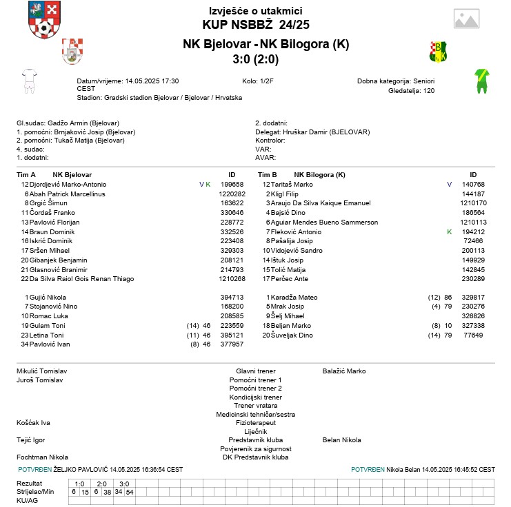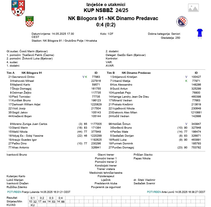 Vjerujemo da će mnoge ovaj rezultat iznenaditi, budući da se ovdje očekivala tvrda i teška utakmica za obje ekipe. Status favorita će većina dati domaćoj ekipi, upravo zbog prednosti domaćeg terena, ali i zbog stanja na tablici Treće NL Sjever. Tamo je Bilogora druga, s pet bodova manje od prvog Varteksa, a Dinamo tek trinaesti, što dovoljno govori. Ipak, na terenu jedna druga priča. U 32. minuti Pejo Kuprešak iz penala dovodi goste u vodstvo, a u 44. Vedran Mlinarić zabija za 0:2 gostiju, a to je ujedno bio i rezultat prvoga poluvremena. U nastavku ista priča, još dva gostujuća gola za konačnih i nestvarnih 0:4. Oba gola postigao je Landry Kamga. Tako Dinamo odlazi u finale gdje će igrati protiv Bjelovara. Bilogora pak neće ponoviti uspjeh iz prošle sezone, kada su u šesnaestini finala Kupa Hrvatske igrali protiv splitskog Hajduka.