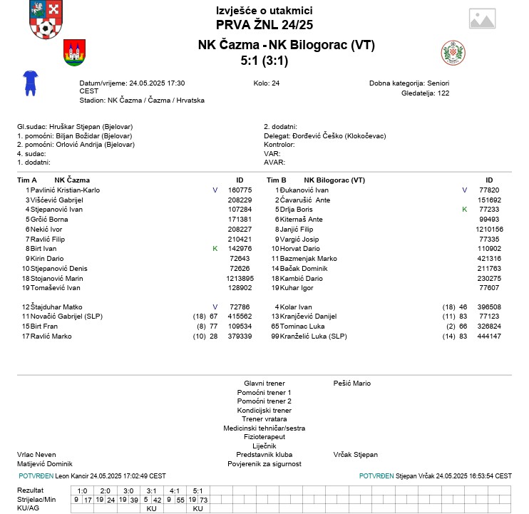 Jučer je utakmicom Čazme i Bilogorca otvoreno 24. kolo 1. ŽNL Bjelovarsko-bilogorske županije. Danas će se odigrati ostali susreti, a nakon ovoga kola bi mnogo toga trebalo biti jasnije što se tiče stanja na tablici. Vrh je ionako riješen, tako da valja izdvojiti borbu za treće mjesto, te naravno borbu za ostanak u ligi. Čazma je uzela vrijedne bodove koji bi vrlo lako mogli biti ključni bodovi spasa, odnosno daljnjeg boravka u ovoj ligi.