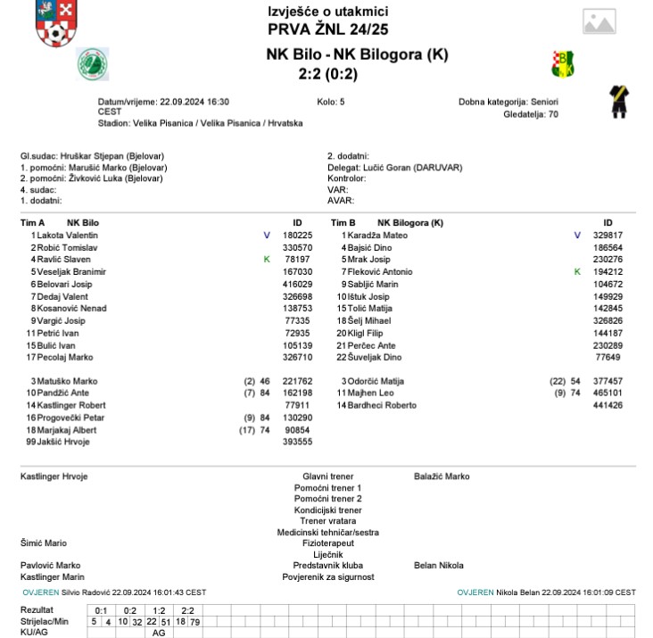 Za kraj imamo utakmicu u Velikoj Pisanici, gdje su odličnu nogometnu predstavu pružili Bilo i Bilogora. Završilo je 2:2. Gosti vode već u 4. minuti golom Josipa Mraka, a njegov imenjak Ištuk u 32. povećava na 2 gola prednosti. U nastavku, Dino Šuveljak autogolom smanjuje na 1:2, da bi Albert Marjakaj postavio konačnih 2:2 i tako otkinuo prve bodove gostima iz Kapele.