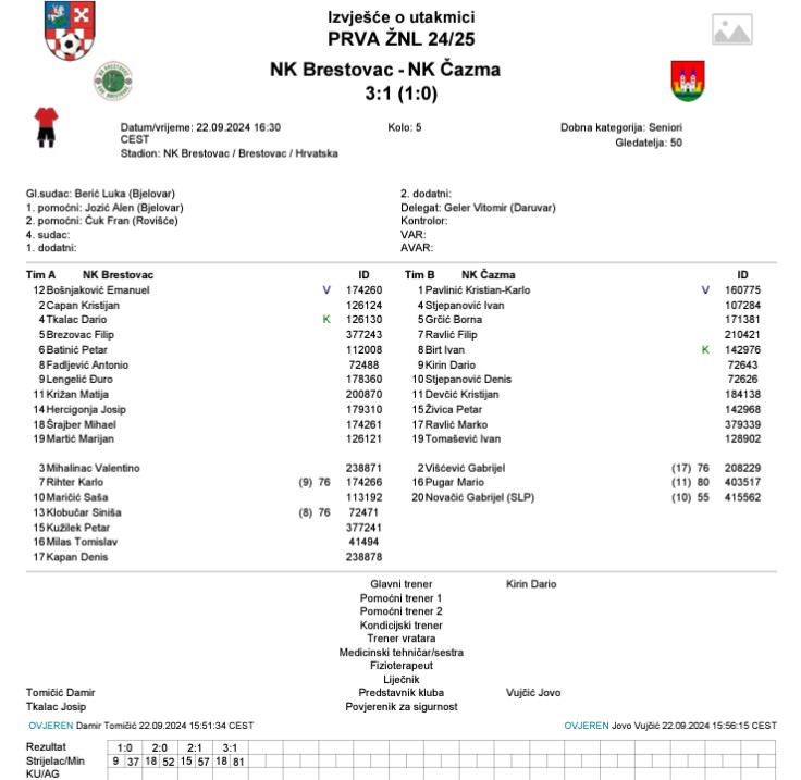 “Kontrolirali smo od početka utakmicu, radili prilike, ali nismo uspjeli zabiti. Brestovac nam je prijetio dugim loptama i kontrama. U 35. minuti poklanjamo gol nakon greške golmana. U 2. minuti drugog poluvremena zabijamo gol, ali nam je poništen. Pokušavamo zabiti, ali ponovno nakon naše greške u našoj polovici dobivamo gol. Nakon nekoliko napada uspijevamo zabiti i dalje se otvaramo i stišćemo, ali pred kraj dobivamo gol za 3-1 i više se nismo uspjeli vratiti.” – riječi su trenera Čazme, Daria Kirina.