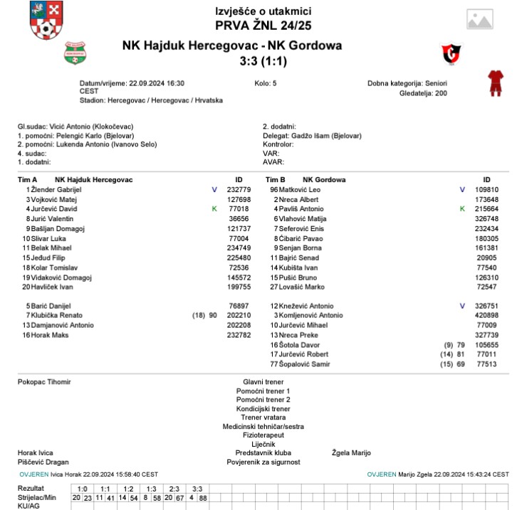 Pregled nastavljamo u Hercegovcu gdje je Hajduk dočekao Gordowu. Poveo je domaćin pogotkom Ivana Havličeka u 23. minuti, no gosti preokreću golovima Senada Bajrića iz 41., Ivana Kubište iz 54., te Pavla Ćibarića iz 58. minute. Havliček vraća nadu domaćinu svojim drugim pogotkom u 67. minuti, da bi konačnih 3:3 postavio David Jurčević u 88. minuti i tako otkinuo prve bodove Gordowi ove sezone.