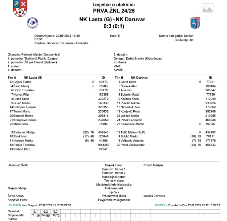Daruvar ne posustaje. Nakon petog kola njihova je i peta pobjeda, a brojka primljenih golova je i dalje na nuli. Ovoga puta stradala je Lasta, s tri pogotka razlike. Zabijali su Ivo Anić u 19., Leonardo Patek u 60., te Karlo Karačić u 73. minuti. Tako je Daruvar ovom pobjedom ostao jedina stopostotna momčad nakon prvih pet kola, jer su kiksali njegovi prvi pratitelji.