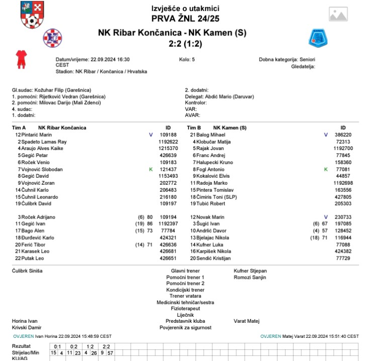 “Utakmica koja je od početka išla nama u korist i gdje smo već do poluvremena imali sve ponuđeno da ostvarimo pobjedu no mi to nismo iskoristili niti uspjeli ostvariti. Jedan od pokazatelja kakva je situacija bila na terenu je i ta da je protivnički vratar najbolji pojedinac susreta, a takvim pristupom i razvojem situacije na terenu ne može se uzeti ništa više od jednog boda u gostima kod dobre ekipe i jako neugodnog protivnika kao što je NK Ribar iz Končanice vođeni odličnim trenerom gospodinom Ćulibrkom. Rezime je da sam ja kao trener svoje ekipe glavni krivac što nismo uzeli sva tri boda jer današnja svaka moja odluka i svaki moj potez je očigledno bio krivi. Žao mi je što je to tako ispalo, ali eto takav je trenerski posao. Mi kao ekipa idemo dalje raditi svi zajedno na sebi jer samo radom možemo napredovati.” – Sanjin Romozi, trener Kamena.