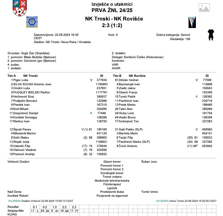 Odlična je utakmica odigrana u Novoj Rači. Tamo je domaći Trnski s 2:3 poražen od Rovišća. Gost vodi s dva gola razlike zahvaljujući pogotcima Ivana Pavličevića u 3., te Lorisa Hrubyja u 39. minuti. Samo dvije minute kasnije Ivan Plantek smanjuje rezultat, da bi Andrija Pavlović u 48. vratio stvari na početak. Sva tri boda gostima donosi Pavličević svojim drugim pogotkom u 77. minuti.