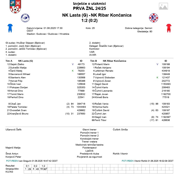 „Pobjeda u Gudovcu! U pretposljednjem kolu naši seniori su pobijedili NK “Lastu” Gudovac rezultatom 1:2. U vodstvo smo došli u 1. poluvremenu golovima Adrijana Ročeka i Renata Lefelmana, a domaćin je smanjio na 1:2 u 2. minuti sudačke nadoknade drugog poluvremena. Čestitke treneru i igračima na ovoj važnoj pobjedi, kojom smo nakon dugo vremena pobjegli s posljednjeg mjesta na tablici. U zadnjem kolu dočekujemo NK “Bilo” iz Velike Pisanice, a ostali konkurenti za posljednje mjesto na tablici imaju isto vrlo zanimljive utakmice. Uglavnom, očekuje nas vrlo zanimljivo posljednje kolo. Sretno svima!“ – Ivan Horina, tajnik Ribara.