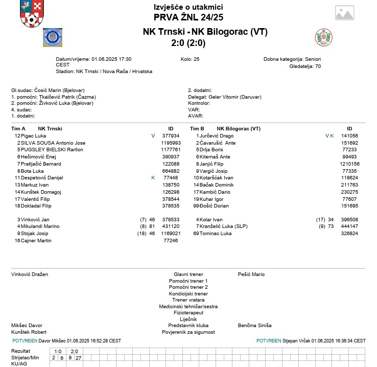 Trnski je ostvario sigurnu i lijepu pobjedu od 2:0 protiv Bilogorca čime su došli na prag četvrtoga mjesta. U 6. minuti su poveli preko Silva Souse, da bi konačan rezultat postavio Luka Bota u 27. minuti utakmice. Bilogorac je upisao četvrti poraz za redom, a sada su pali na posljednje mjesto prvenstvene ljestvice, te ih čeka velika borba u posljednjem kolu.