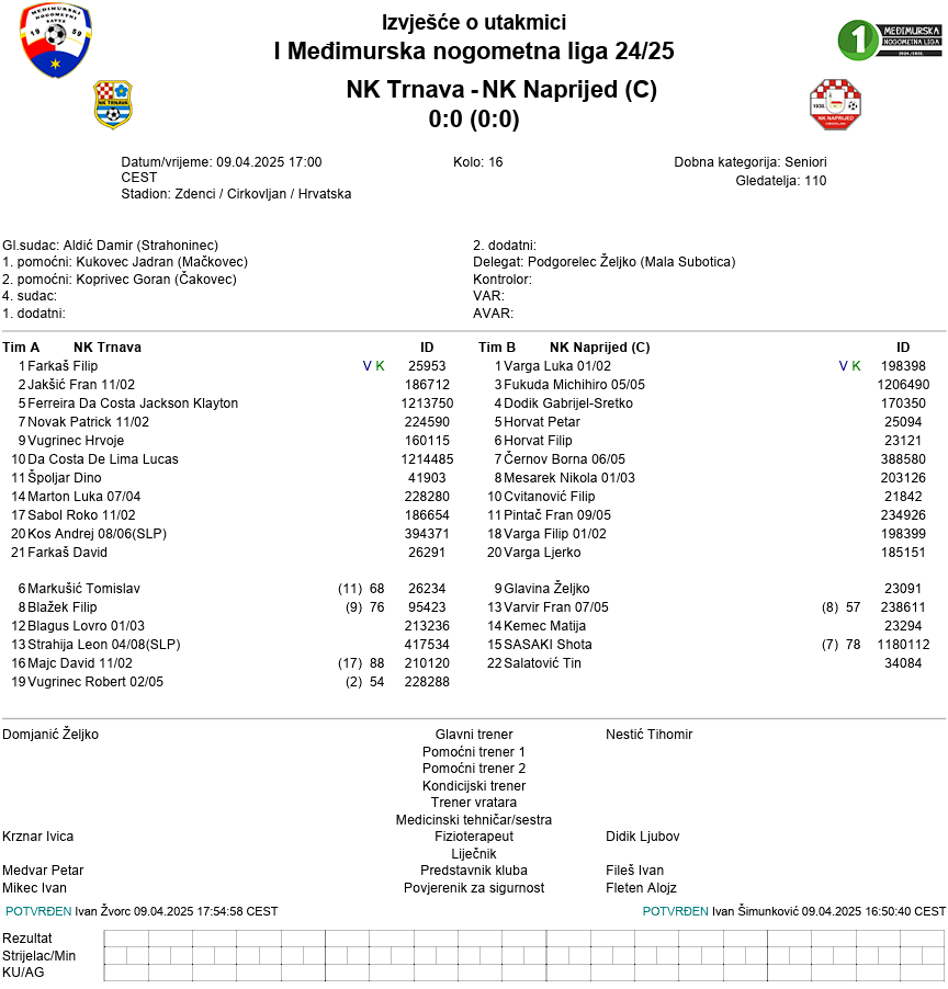 Trnava je na Sportskom parku Zdenci „ugostila“ Naprijed u okviru nadoknade šesnaestog kola i s njim podijelila bodove. Iako se je utakmica bila vrlo živa i atraktivna, na kraju je završila bez pogodaka. Da stvar bude gora po „gostujuće“ nogometaše, dva puta su pogađali okvir gola u 55. i 77. minuti, ali za pogodak je na kraju falilo sreće. Obje momčadi na diobi su osmog mjesta, jer nakon međusobnog dvoboja imaju jednak broj osvojenih bodova.