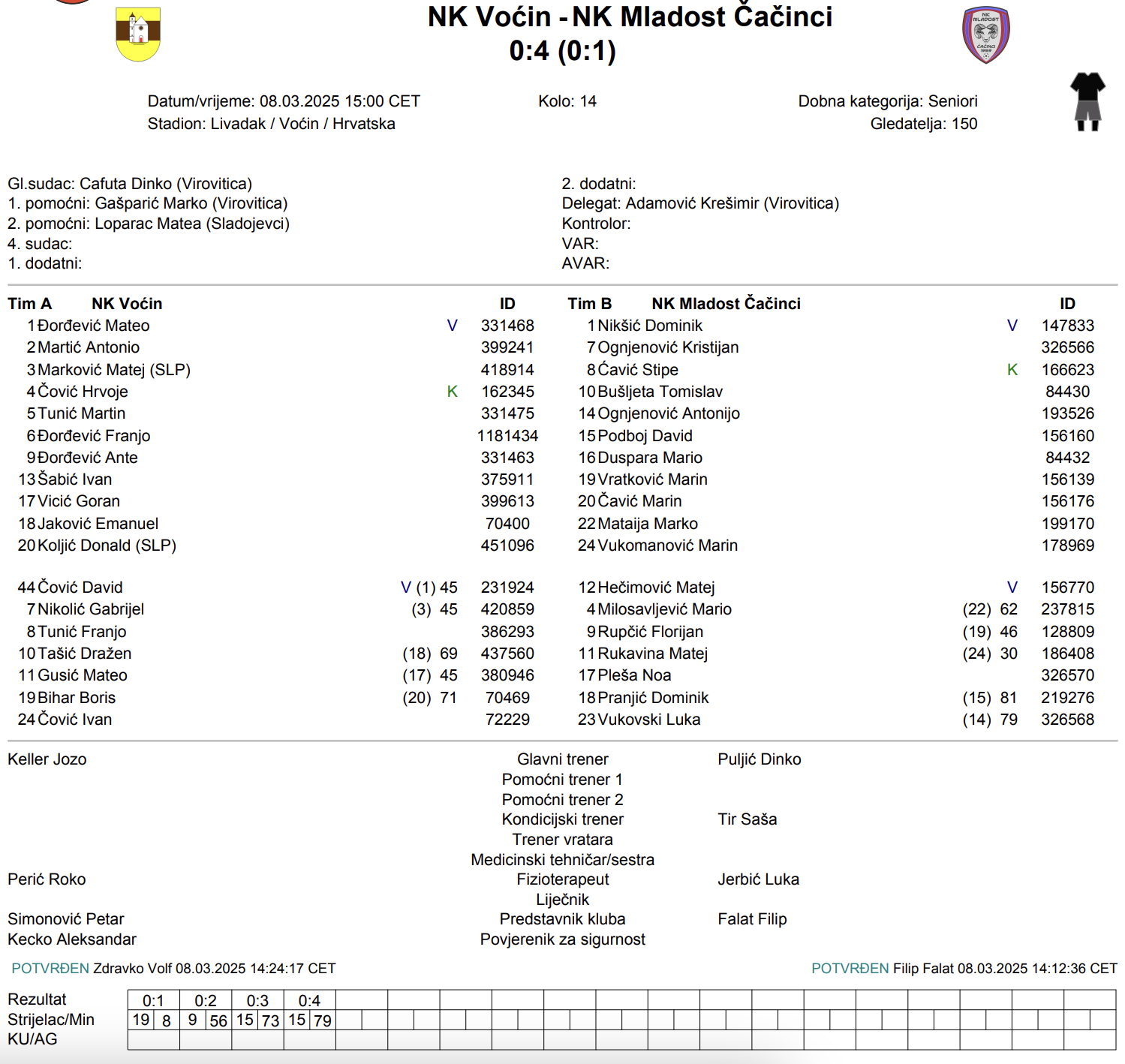 Mladost Čačinci nastavila je sjajnu formu uvjerljivom pobjedom na gostovanju kod Voćina. Gosti su od samog početka preuzeli kontrolu nad utakmicom, a rani pogodak Marina Vratkovića u osmoj minuti dao je ton dvoboju. Voćin se pokušavao vratiti, ali je Mladost nastavila s pritiskom i u drugom dijelu susreta riješila pitanje pobjednika. Florijan Rupčić povisio je na 2:0 u 56. minuti, a dvostruki strijelac David Podboj zaključio je priču s dva brza gola u završnici susreta. Mladost Čačinci ovom pobjedom učvrstila se u gornjem dijelu tablice, dok Voćin ostaje na sredini tablice sa 16 bodova.
