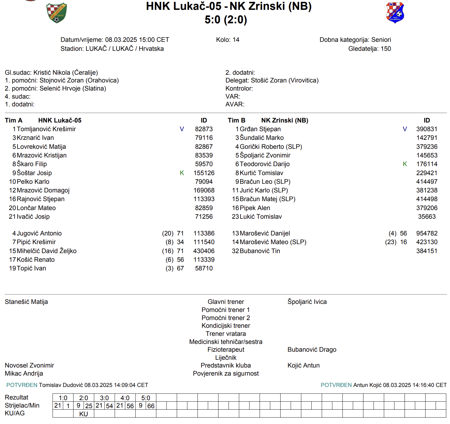 Lukač demonstrirao je moćnu predstavu pred svojim navijačima i deklasirao Zrinski s uvjerljivih 5:0. Već u prvoj minuti domaći su poveli preko Josipa Ivačića, koji je kasnije kompletirao hat-trick. Gosti su djelovali izgubljeno na terenu, a Lukač je lako dolazio do prilika. Josip Šoštar također se istaknuo s dva pogotka, jedan je postigao iz kaznenog udarca, dok je Zrinski ostao bez odgovora. Ova pobjeda donosi Lukaču važne bodove u nastavku borbe za vrh tablice, dok Zrinski mora pronaći način da preokrene loš niz u nadolazećim kolima.