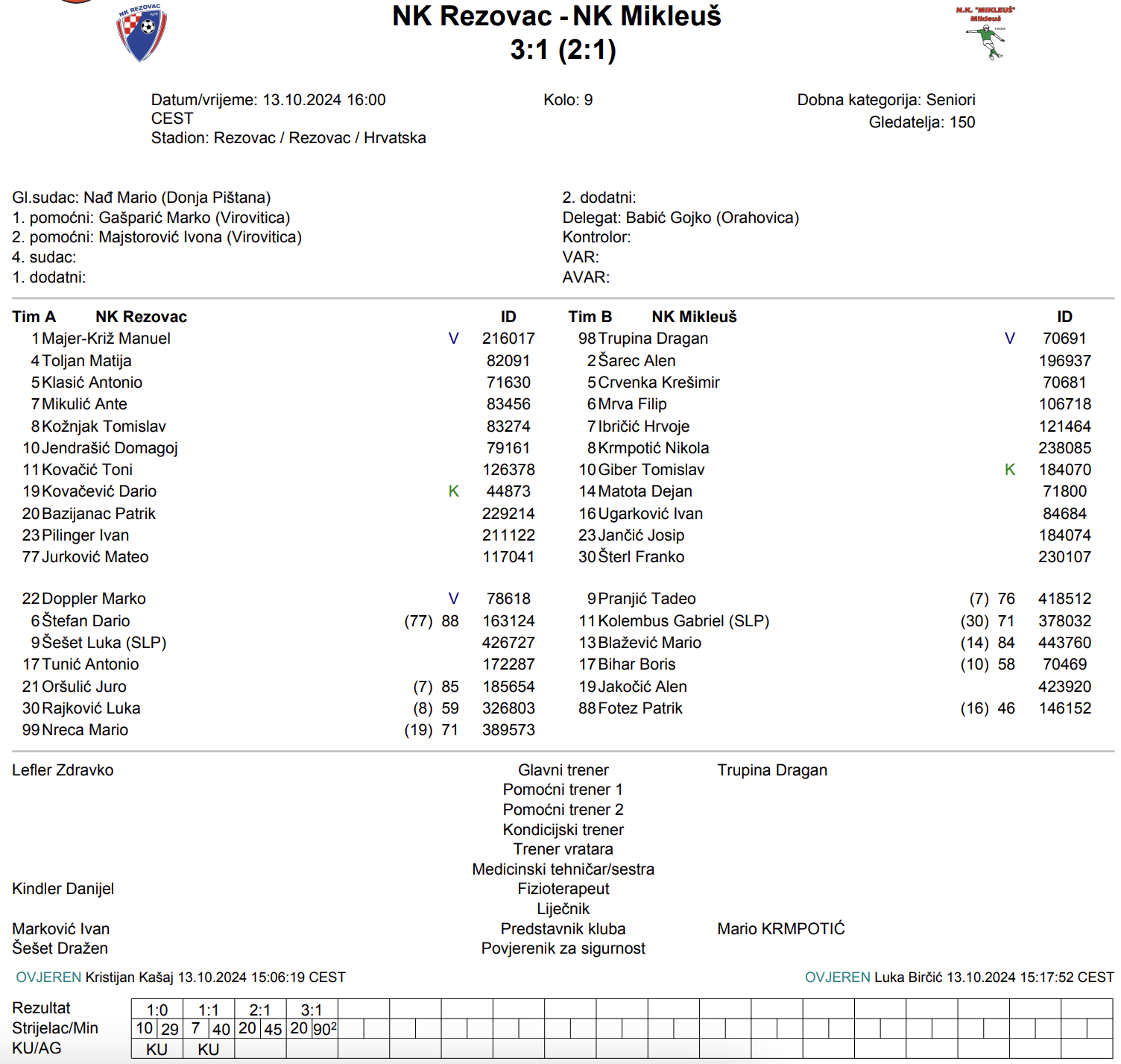 Rezovac je sigurno stigao do tri boda na domaćem terenu. Prvo poluvrijeme završilo je rezultatom 2:1. Rezovac je poveo iz kaznenog udarca u 29. minuti, koji je izveo Domagoj Jendrašić. Mikleuš je izjednačio u 40. minuti pogotkom Hrvoja Ibričića, no Rezovac ponovo dolazi u vodstvo pogotkom Patrika Bazijanca u 45. minuti. U drugom poluvremenu Bazijanac je u 92. minuti zaključio pobjedu Rezovca. Ovi bodovi su vrlo bitni za Rezovac, koji se tako malo odvojio od začelja tablice, dok Mikleuš i dalje ostaje s tri boda.