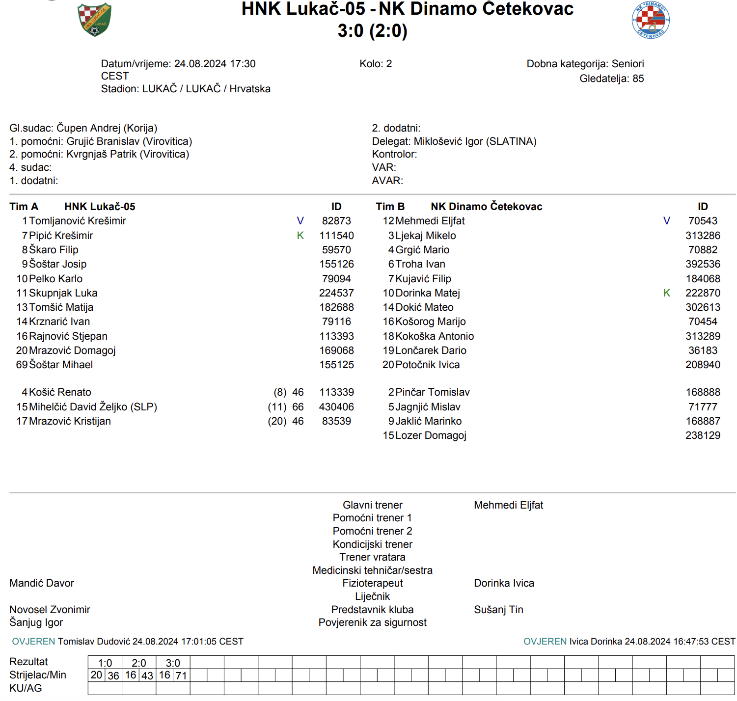 Po teškom i sparnom vremenu Lukač je na domaćem terenu izborio tri boda. Bez primljenog pogotka u dvije utakmice i sa šest bodova, trenutno su na prvom mjestu, pokazujući da su spremni za borbu za naslov od samog početka prvenstva. S druge strane, Četekovac nakon dvije gostujuće utakmice ima 0 bodova. Prvo poluvrijeme završilo je rezultatom 2:0, pogocima Domagoja Mrazovića u 36. minuti i Stjepana Rajnovića u 43. minuti. U drugom poluvremenu, Lukač je postigao i treći pogodak, a Rajnović je upisao svoj drugi gol na utakmici u 71. minuti.