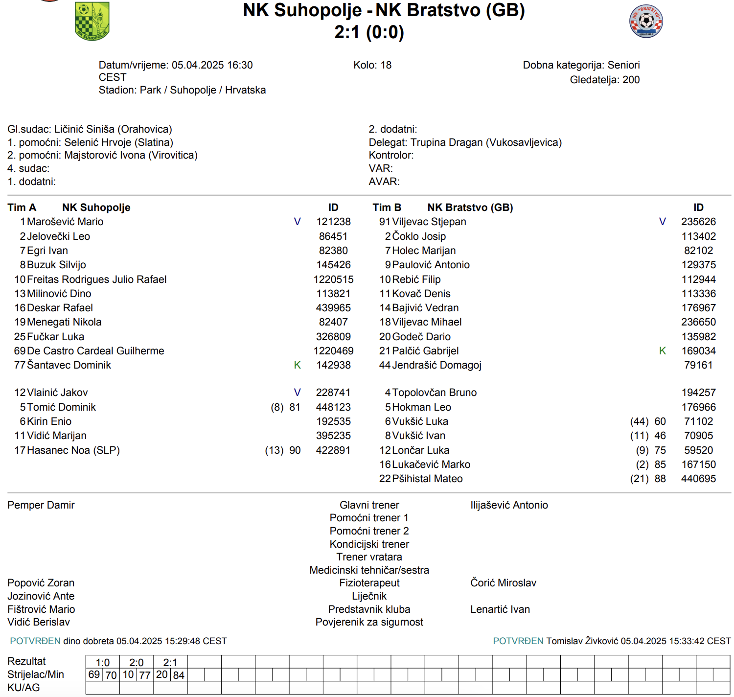 Suhopolje je na domaćem terenu savladalo Bratstvo rezultatom 2:1. U prvom poluvremenu nismo mogli vidjeti pogotke, ali bila su dva penala koja domaćin nije realizirao, pa je mogao puno lakše završiti utakmicu. U drugom poluvremenu, tek pred kraj smo mogli vidjeti sva tri pogotka na utakmici. Suhopolje je povelo 2:0 pogocima De Castro Cardeal Guilhermea u 70. minuti i Freitas Rodrigues Julio Rafaela u 77. minuti, dok je jedini pogodak za goste postigao Dario Godeč u 84. minuti. Suhopolje drži priključak vrhu, dok Bratstvo ostaje na 6. mjestu s 22 boda.