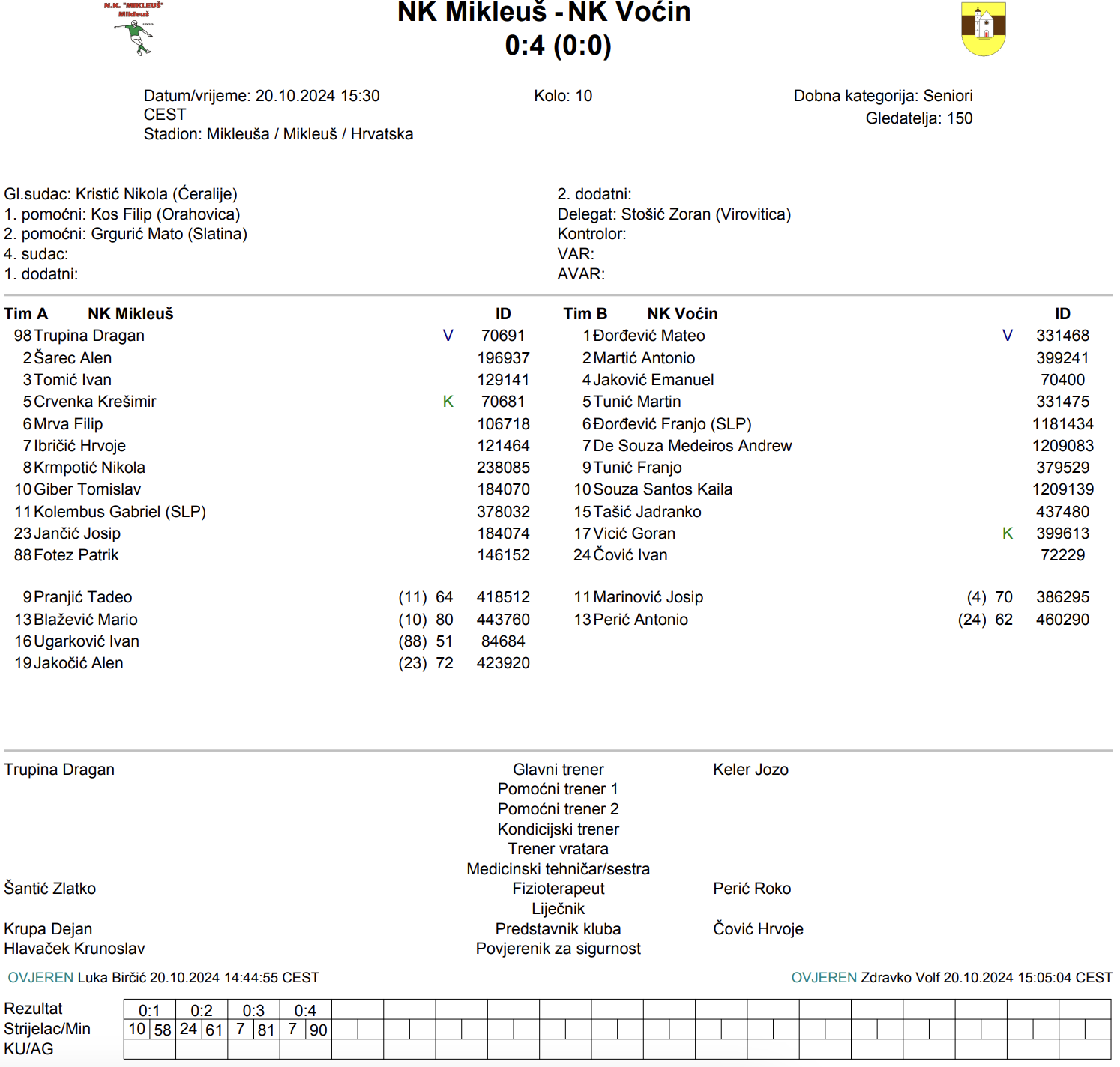 Voćin je u Mikleušu uvjerljivo slavio. Prvo poluvrijeme prošlo je bez pogodaka, dok je u drugom poluvremenu Voćin odigrao puno bolje. Poveo je Voćin preko Kaila Souze Santosa u 58. minuti, povećao je Ivan Čović u 61., a preostala dva pogotka postigao je Andrew De Souza Medeiros u 81. i 90. minuti.
