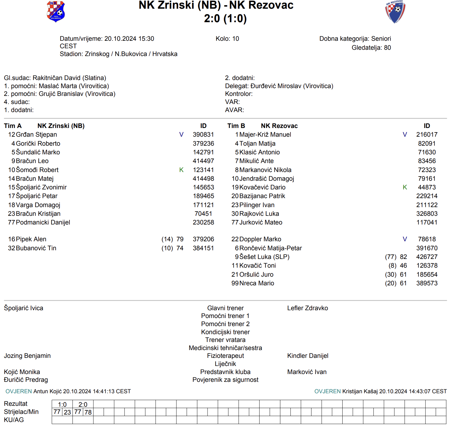 Zrinski je nakon 10. kola stigao do prve pobjede. Slavili su na domaćem terenu protiv nemoćnog Rezovca. Oba pogotka postigao je Danijel Podmanicki. U prvom poluvremenu, u 23. minuti, na asistenciju Petra Špoljarića, a u drugom poluvremenu savladao je situaciju 1 na 1.