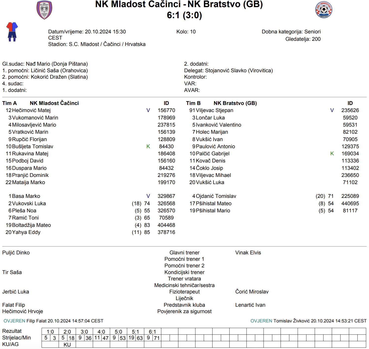 Uvjerljiva pobjeda Čačinaca na domaćem terenu. Čačinci su poveli u 3. minuti preko Marina Vratkovića, a Vratković je povećao i na 2:0 iz kaznenog udarca u 18. minuti. Sa 3:0 se otišlo na odmor; gol je postigao Florijan Rupčić u 36. minuti. U drugom poluvremenu Matej Rukavina povisuje na 4:0 u 47. minuti, a Rupčić je dodao još dva pogotka i kompletirao svoj hat-trick pogocima u 53. i 71. minuti. Počasni pogodak za Brasku postigao je Mario Pšihistal u 61. minuti.
