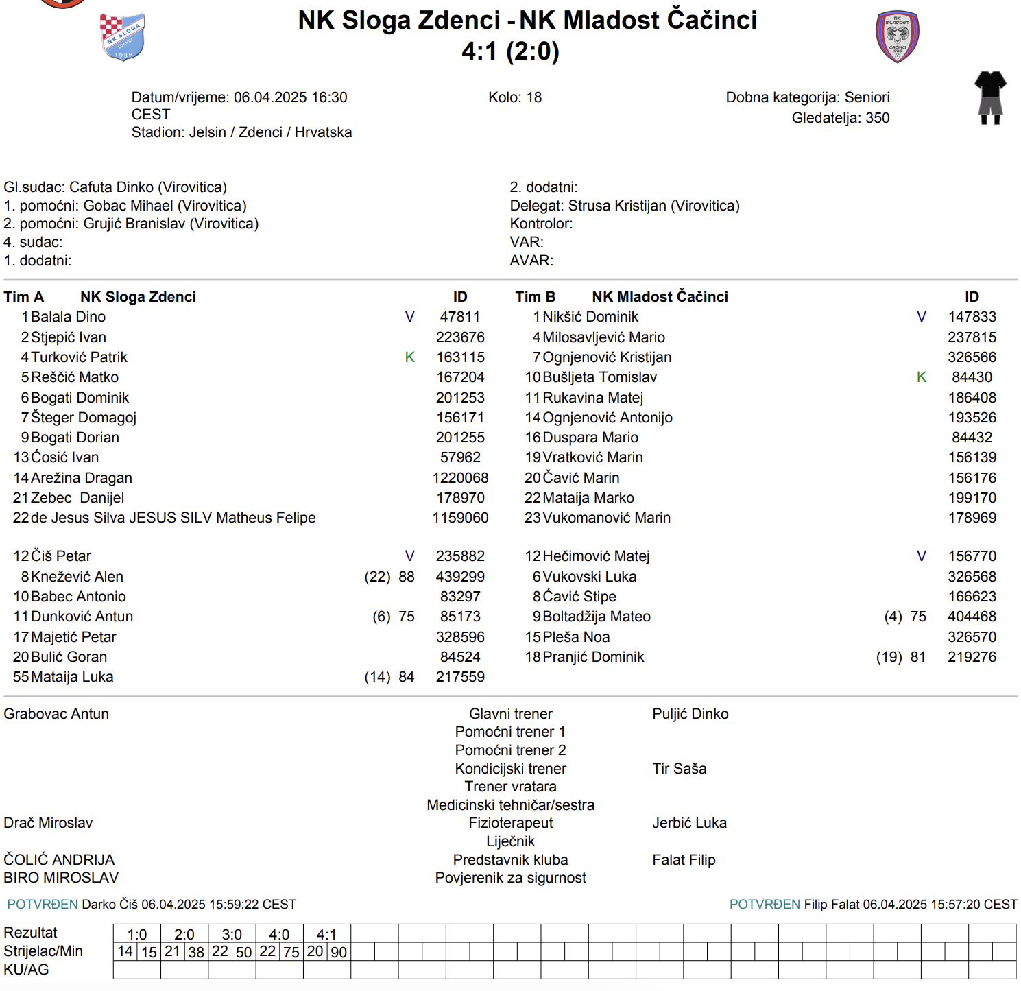 Sloga Zdenci odigrala je sjajnu utakmicu protiv lidera prvenstva i upisala uvjerljivu pobjedu. Poveli su već u 15. minuti preko Dragana Arežine, a na 2:0 povisio je Danijel Zebec u 38. minuti. U drugom dijelu briljirao je Matheus Felipe de Jesus Silva, koji je s dva gola u 50. i 75. minuti zapečatio pobjedu domaćih. Marin Čavić je u 90. minuti postavio konačnih 4:1. Sloga je na bod Lukaču, a za Mladosti kasni 6 bodova koja ima utakmicu više.