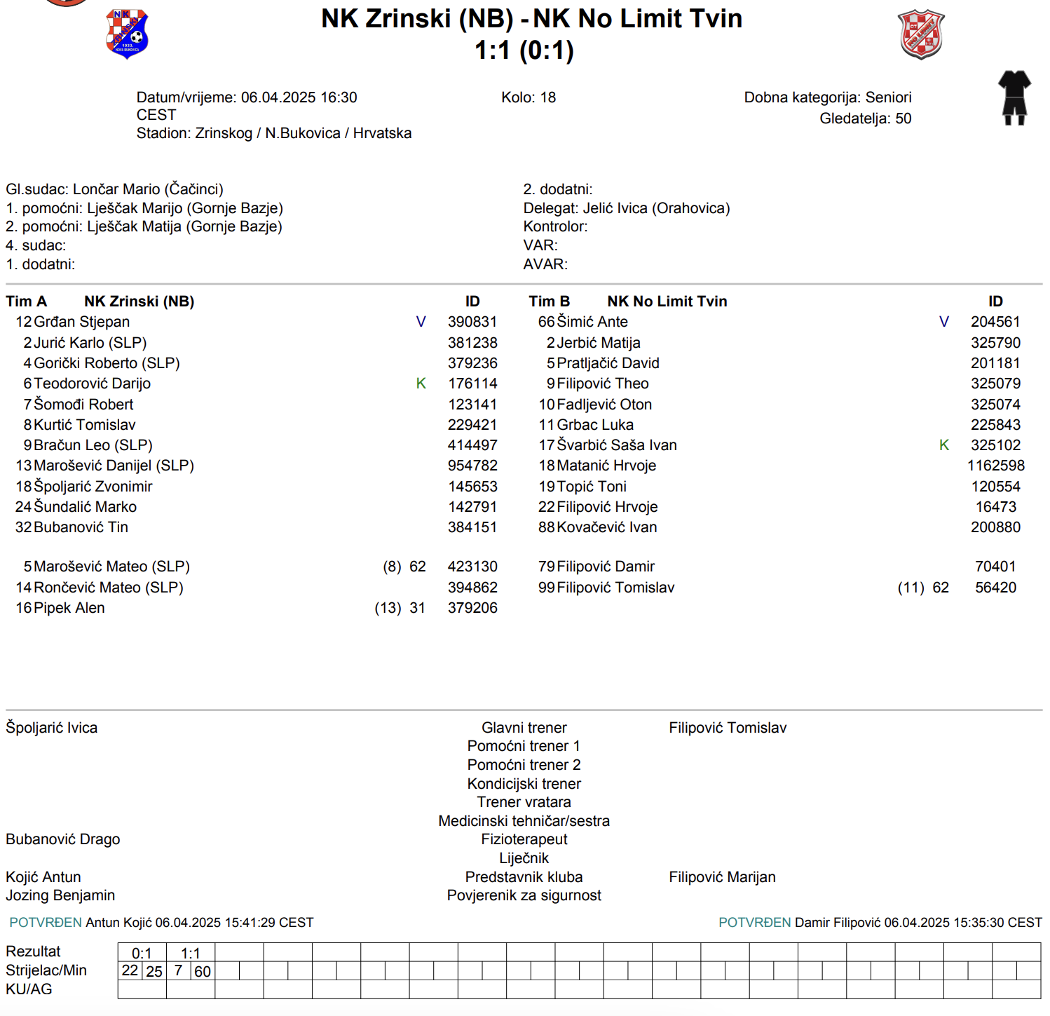 Zrinski je stigao do vrijednog boda protiv Tvina. Hrvoje Filipović doveo je goste u vodstvo u 25. minuti, ali Robert Šomodi je u 60. minuti poravnao i donio bod domaćima. Utakmica je bila tvrda, bez previše prilika, no borbenost nije izostala.