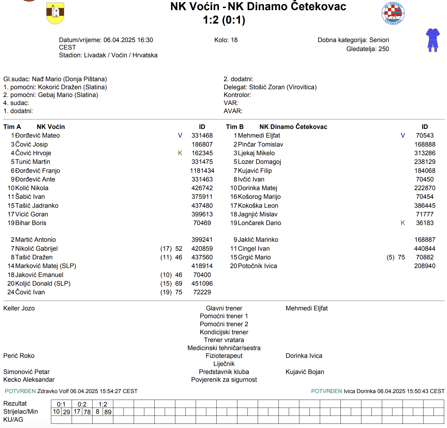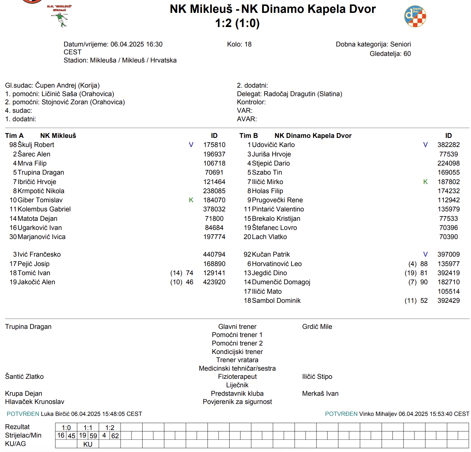 Domaći su poveli pogotkom Ivana Ugarkovića u 45. minuti, ali gosti su pokazali snagu i preokrenuli. Lovro Štefanec zabio je u 59. iz kaznenog udarca, a samo tri minute kasnije Dario Stjepić pogodio je za pobjedu Dinama. Važni bodovi za goste u borbi za gornji dom ljestvice.