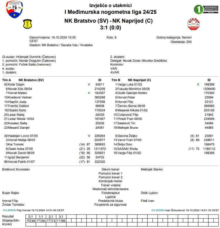 Bratstvo je u Savskoj Vesi nakon preokreta svladalo Naprijed. Do prvih pogodaka čekalo se drugo poluvrijeme, ali vrijedilo je čekati budući da su u drugom postignuta čak četiri. Prvi su do gola došli gosti jer je Filip Cvitanović u 59. minuti doveo Naprijed u prednost. Samo minut kasnije Dalibor Frančić tu je prednost poništio, a potom u 73. minuti potpuno preokrenuo rezultat u korist svog Bratstva. Benjamin Ignjić imao je završnu riječ jer je pogotkom u 86. minuti postavio konačan rezultat za sigurnu pobjedu Bratstva.