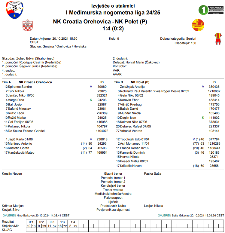 Polet se polako, ali sigurno probija do vrha Prve Međimurske NL. Nova pobjeda u Orehovici dovoljna je da održi korak za vodećim Pušćinama. Četiri pogotka i četiri različita strijelca dovoljan su pokazatelj raznolikih opcija koje Polet krije u svojim nogama. Najbolji strijelac lige Nikola Munđar ponovno je pronašao put do pogotka. Kapetan Deglin, Renan Franca i Mohamed Asli također su dali svoj doprinos pogocima.