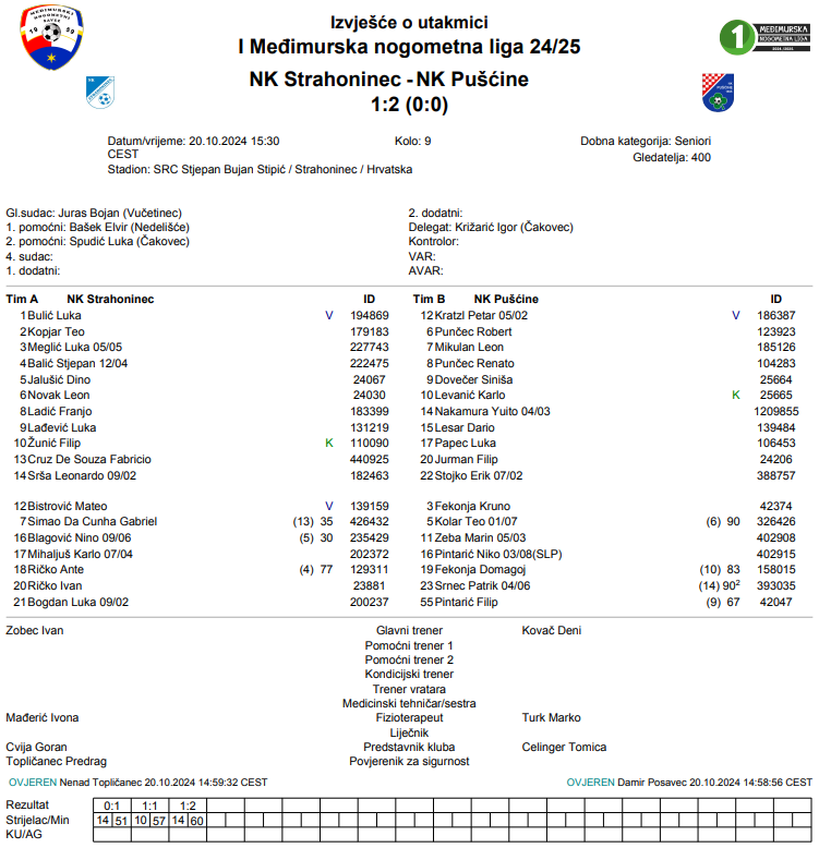Strahoninec je na svom terenu pružio odličan otpor vodećoj momčadi lige. Dobra utakmica na obje strane ipak je donijela bodove Pušćinama. Najzaslužniji za to bio je Yuito Nakamura koji je s dva prekrasna pogotka omogućio Pušćinama novi trijumf. Za domaće je pogodak postigao kapetan Filip Žunić, a svojim sjajnim obranama istakao se i vratar Luka Bulić. Pušćine ovom pobjedom ostaju u društvu Međimurca (DP) i Slobode (M) jer su jedine tri momčadi koje nisu doživjele poraz u Međimurskom nogometnom savezu.