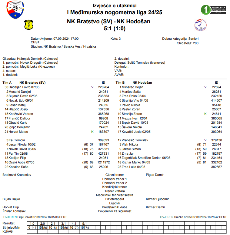 Bratstvo je jedna od najefikasnijih momčadi Prve Međimurske NL i ne planira stati. Nova žrtva njihove pobjede bio je Hodošan koji je gostovao u Savskoj Vesi. Kako kaže popularan izraz među navijačima „pukla je petarda“ u mreži Hodošana. Za tu petardu zaslužni su Knežević i Osaki koji su zabili po dva pogotka, a jedan je dodao Novak. Upravo su navijači veliki vjetar u leđa Bratstva jer osim što posjećuju utakmice u velikom broju, na sebi svojstven način proslavljaju svaki pogodak. Zbog toga nogometaši Bratstva i zabijaju jer se raduju svakoj novoj proslavi istih. Za Hodošan je pri rezultatu 2:0 zabio Strahija i unio nadu za bodove koja je brzo ugašena.