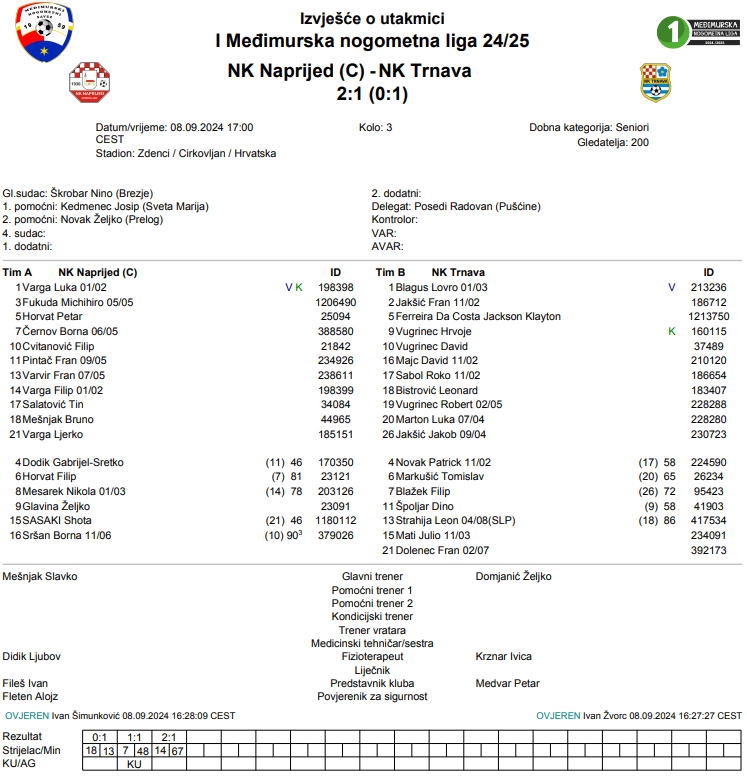 Naprijed je preokretom protiv Trnave sačuvao sva tri boda u Cirkovljanu. U utakmici punoj tempa s obje strane prvo su poveli gosti preko Bistrovića u 13. minuti utakmice. Do sljedećeg pogotka čekala se 48. minuta kada je Černov bio precizan s bijele točke i zabio za poravnanje rezultata. Za preokret i pobjedu zaslužan je Varga jer je u 67. minuti pronašao put do pogotka i postavio rezultat 2:1.