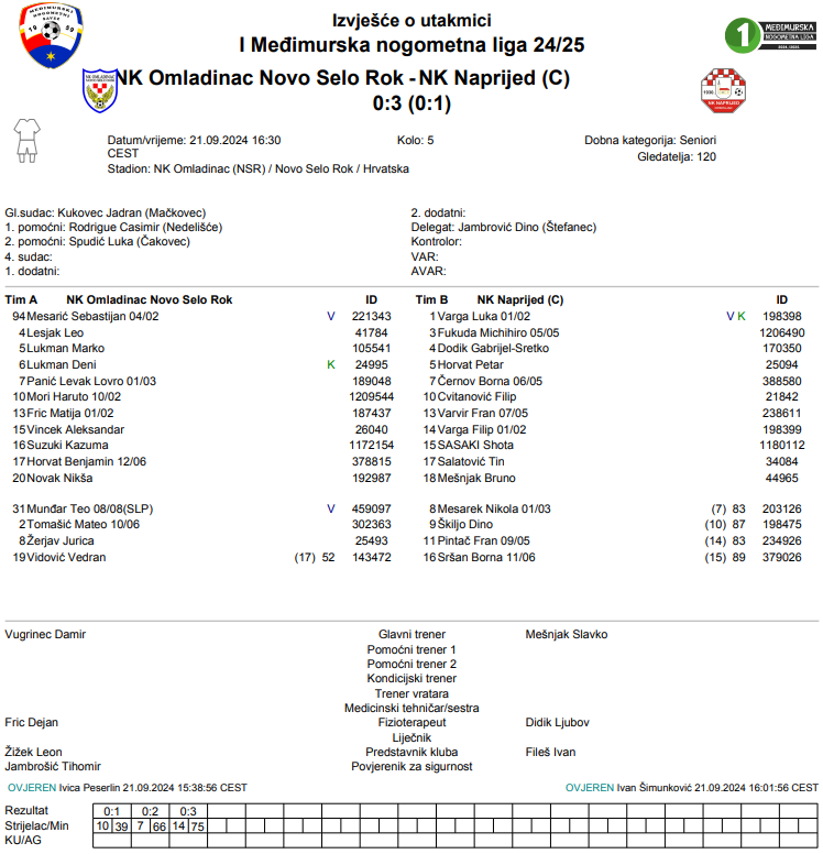 Naprijed je pobijedio četvrtu utakmicu zaredom. U subotu su bili bolji na gostovanju u Novom Selu Rok kod domaćeg Omladinca. Cvitanović ih je doveo u vodstvo pred kraj prvog dijela. Černov je sredinom drugog dijela povisio prednost na 0:2, a konačan rezultat 0:3 postavio je Varga u 75. minuti utakmice. Omladinac je nakon dvije vezane pobjede izgubio pa ostaje na šest bodova, dok je Naprijed upisao svoj dvanaesti bod iz pet utakmica.