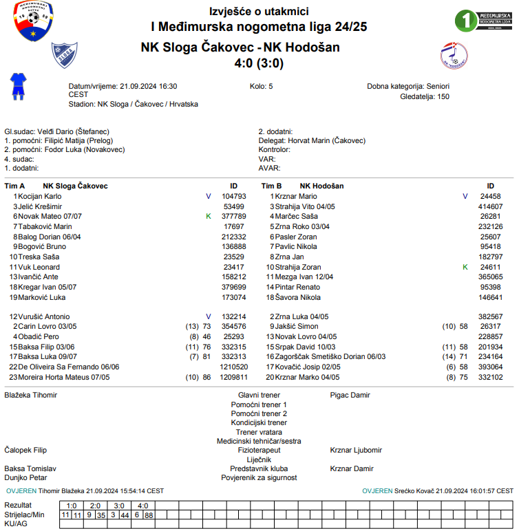 Sloga je jaka i nemilosrdna protiv svojih protivnika. Iako su i oni kao i Polet imali ritam utakmica srijeda-subota zbog obaveza u kupu MNS-a, to ih nije spriječilo da uvjerljivo svladaju svoje protivnike. Vuk, Bogović i Jelić odradili su najveći dio posla u prvom djelu utakmice jer su postigli pogotke za uvjerljivu prednost 3:0 na predahu. U nastavku je domaćoj Slogi ostalo samo dovršiti posao, a kapetan Novak postigao je sjajan pogodak za potvrdu pobjede. Na kraju je Sloga slavila 4:0 protiv gostiju iz Hodošana.