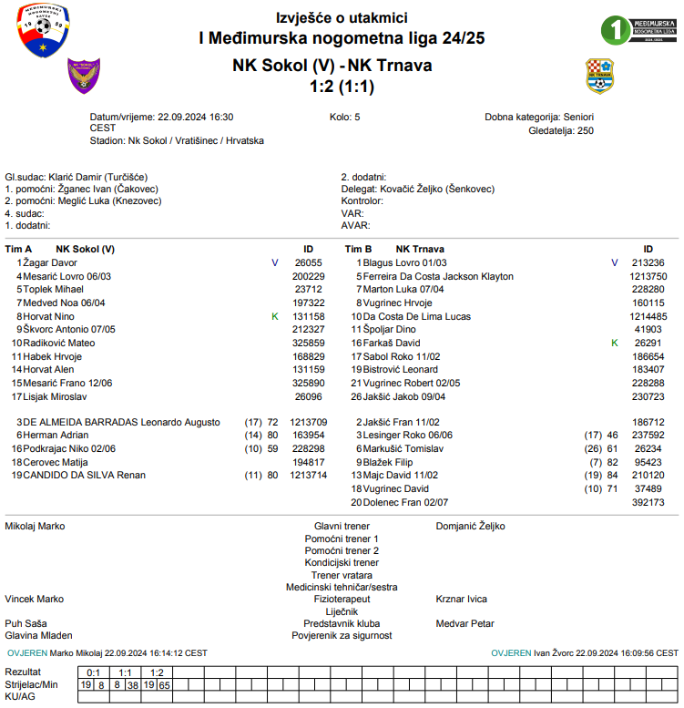 Sokol i Trnava odigrali su borbenu utakmicu u Vratišinecu. Nakon niza poraza, Trnava je slavila na gostovanju u petom kolu i to na pogon Leonarda Bistrovića. On je zabijao u 8. i 65. minuti pogotke koji su osigurali Trnavi prve bodove ove sezone. U domaćem sastavu kapetan Sokola Nino Horvat zabio je u 38. minuti pogodak za izjednačenje, a u 70. je isključen nakon drugog žutog kartona. Zahtjevna utakmica za suđenje završena je s čak 10 žutih kartona, ali je Trnava ipak uspjela slaviti. Sokol nakon ove utakmice ostaje na četiri boda koja su osvojili u prva dva kola.