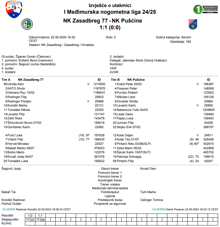 Zasadbreg je prvi koji je u pet utakmica pronašao rješenje kako zaustaviti Pušćine. Ne u potpunosti jer im nisu uzeli sva tri boda, ali djelomično da jer su ih ostavili na „samo“ jednom bodu. Nakon mirnijeg prvog dijela, drugi je dio počeo obećavajuće. Prvo je Bruno Šimunković zabio za prednost Zasadbrega, ali je ona trajala kratko jer je Luka Papec izjednačio samo dvije minute kasnije. Promjene rezultata više nije bilo pa je utakmica završena podjelom bodova.