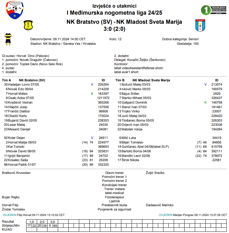 Bratstvo čuva treću poziciju i vreba priliku za drugom i nakon dvanaestog kola. Sedam utakmica zaredom nogometaši Bratstva ne znaju za poraz, a ovoga puta su bili bolji od Mladosti iz Svete Marije. Dalibor Frančić i Matej Lesar zabijali su u prvom djelu, a Edo Novak svoje je gol postigao sredinom drugog dijela. Gosti nisu imali nikakav odgovor, pa je Bratstvo s ova tri pogotka ubilježilo nova tri boda.