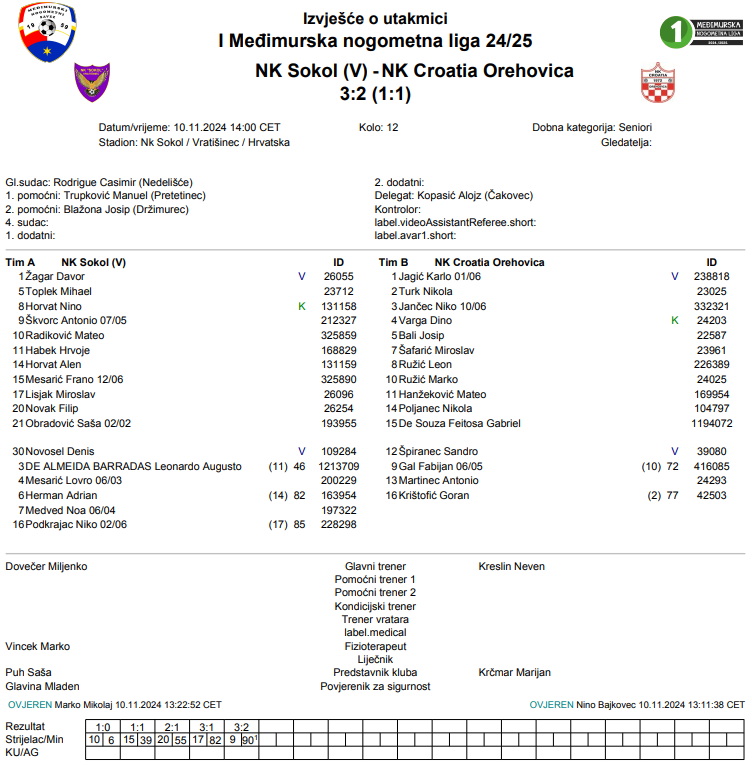 Sokol je do prednosti u dvoboju s Croatiom došao vrlo rano. Već u 6. minuti je Mateo Radiković zabio za vodstvo domaćina. Gabriel De Souza Feitosa morao je istu smanjivati pred kraj prvog dijela, pa se na predah otišlo u rezultatskom egalu. Novu prednost domaćih donio je Filip Novak u 55. minuti, a obje ruke na pobjedu stavio je Miroslav Lisjak kada je pogodio za velikih 3:1 pred kraj utakmice. Fabijan Gal pokušao je u 90. minuti vratiti Orehovicu u život, ali bilo je prekasno za nešto više osim za umanjenja poraza.