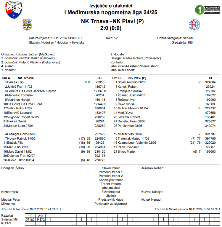 Trnava je bila konkretnija i mirnija u završnici od gostiju iz Paklenice, pa je zasluženo obranila svoja tri boda. Prvi dio utakmice protekao je bez golova, ali su u drugom pogađali jedino domaćini. Prvo je zabio Luka Marton u 62. minuti, a deset minuta kasnije Hrvoje Vugrinec je potvrdio pobjedu Trnave.