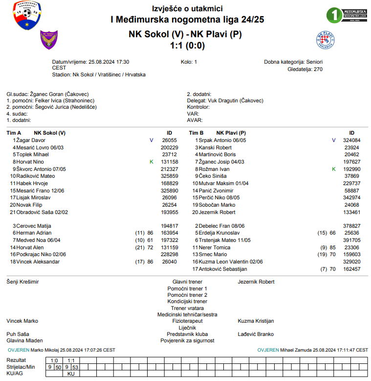 Jedina podjela bodova prvog kola viđena je u Vratišincu. Tamo su snage odmjerili momčadi Sokola i Plavih, ali pobjednika nije bilo. Obje momčadi ušle su utakmicu s velikom željom za golovima i pobjedom, ali su mreže mirovale u prvom dijelu utakmice. Već na startu drugog dijela došli su i golovi. Prvo je Škvorc zabio za prednost domaćih, ali je nakon dosuđenog jedanaesterca u 53. minuti Čeko vratio stvari na početak. Mutvar je ubrzo nakon izjednačenja isključen kod gostiju, ali su izdržali i s igračem manje podijelili bodove s domaćinima. „Iks nije kiks“ navode u taboru Plavih, pa će obje momčadi biti zadovoljne prvim bodovima ove sezone.
