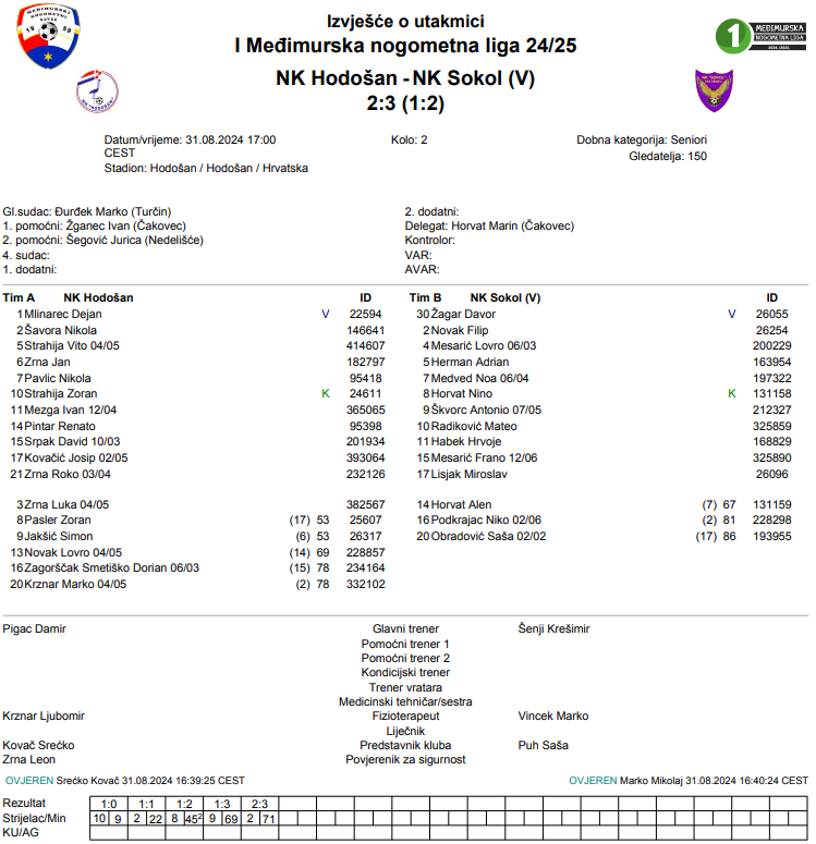 I u Hodošanu je bilo zanimljivo u prvih 20 minuta jer su do tada svoje pogotke zabili Strahija za domaće i Novak za gostujuću momčad. Da ne ostane neriješen ishod na predahu, pobrinuo se Horvat pogotkom u drugoj minuti nadoknade prvog poluvremena, pa su gosti otišli s golom prednosti na pauzu. U nastavku su gosti dobili jedanaesterac koji Lisjak nije pretvorio u pogodak jer je pogodio vratnicu. Nije to zasmetalo Škvorcu koji je čvrsto odlučio da želi dvostruku prednost svoje momčadi i pogodio je za 1:3. Samo dva minuta kasnije Šavora je smanjio zgoditkom u 71. minuti utakmice. Na kraju ove borbene utakmice Sokol je uspio odletjeti sa sva tri boda u Vratišinec jer je do kraja na semaforu ostalo 2:3.
