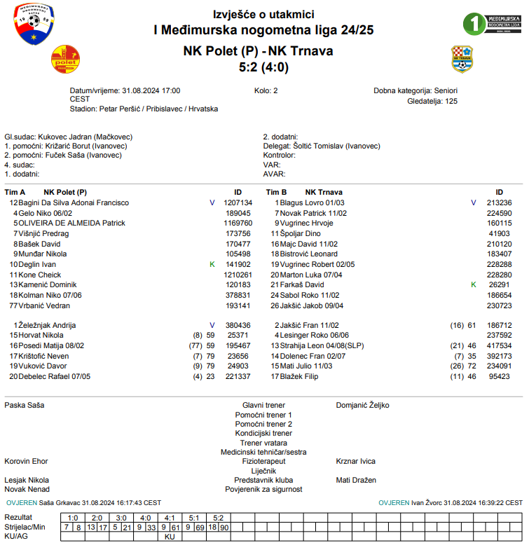 Polet je na svom stadionu bio uvjerljiv protiv Trnave. Višnjić je prvi načeo protivnika u 8. minuti utakmice, a potom Kamenić, Patrick Oliveira i Munđar dodaju još tri za sigurnih 4:0 i rješenje pitanja pobjednika već u prvom dijelu. U nastavku je Vugrinec smanjio s bijele točke na 4:1, ali je Munđar odmah potom ponovno zabio za novu prednost od četiri pogotka. Na kraju utakmice Bistrović je postavio konačan rezultat 5:2