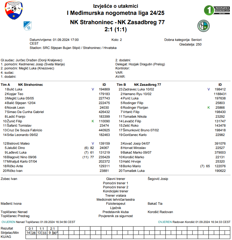 Strahoninec je nakon prošlotjednog poraza naučio na greškama i ovoga puta kod kuće slavio protiv Zasabrega. U napetoj utakmici su uspjeli preokrenuti rezultat i u sudačkoj nadoknadi doći do velika tri boda. Levačić je goste doveo u prednost u 28. minuti, ali je Fabricio Cruz već u 33. minuti vratio stvari na početak. Veliko slavlje domaćih nastupilo je nakon pogotka Lađevića u 93. minuti sudačke nadoknade.