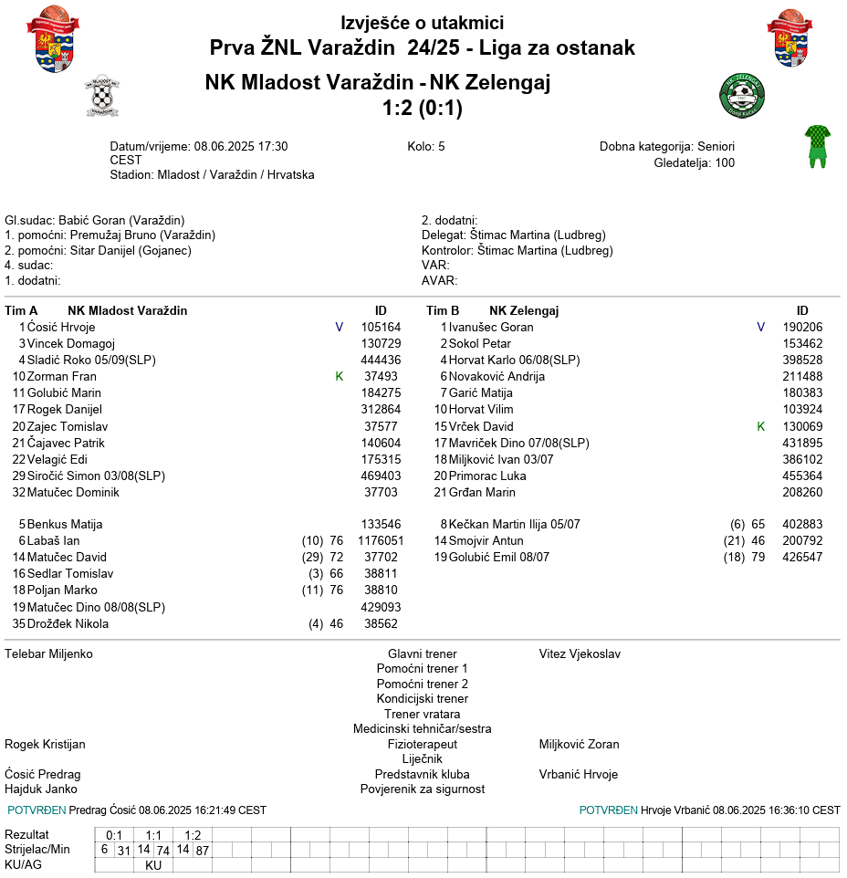 Iako je domaćoj momčadi i bod bio dovoljan za ostanak, na kraju nisu uspjeli izboriti nastavak natjecanja u Prvoj ŽNL Varaždin. Splet nesretnih okolnosti kulminirao je eliminacijom varaždinske Mladosti iz natjecanja. Prvo, Edi Velagić promašio je jedanaesterac koji bi potencijalno ostavio barem bod u Varaždinu i on bi bio dovoljan za ostanak. Nadalje, eliminacijski pogodak primili su u samoj završnici utakmice jer je Antun Smojvir donio pobjedu Zelengaju tek u 88. minuti susreta. Na kraju, unatoč jednakom broju bodova kao i Beretinec, te jednakoj gol razlici, presudio im je broj postignutih pogodaka, pa će naredne sezone igrati u Drugoj ŽNL Varaždin.