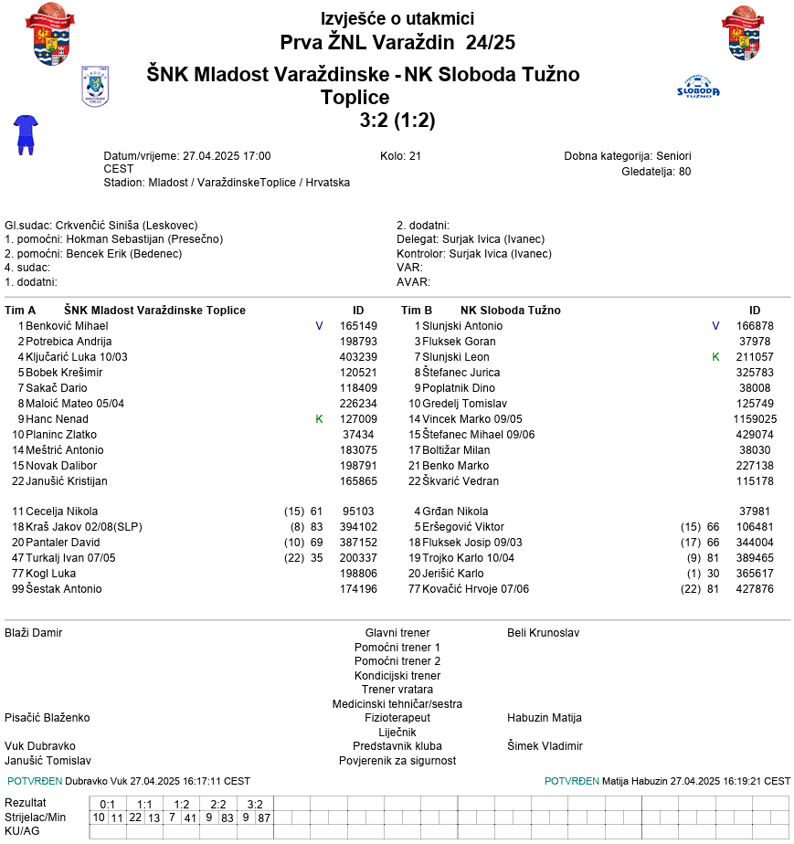 Važnu pobjedu ostvarila je i Mladost iz Varaždinskih Toplica. U borbi za očuvanjem prvoligaškog statusa, nogometašima Mladosti svaki bod je bitan, a ovog su vikenda upisali sva tri protiv Slobode iz Tužnog. U utakmici u kojoj su se iz zaostatka morali vraćati čak dva puta, uspjeli su rezultat preokrenuti u svoju korist i na kraju slaviti. Kristijan Janušić i Nenad Hanc najzaslužniji su za taj podvig.